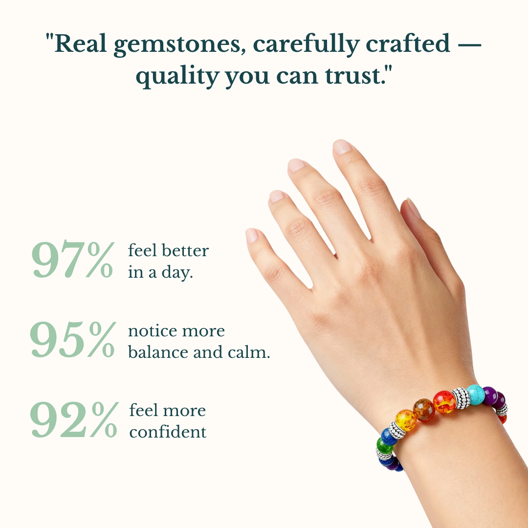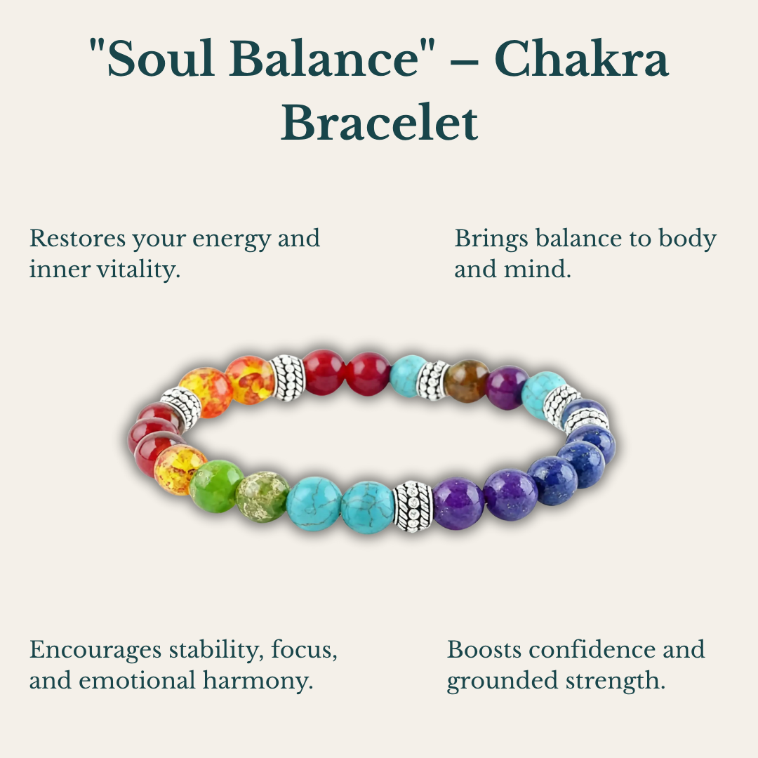 The “Soul Balance” – Chakra Bracelet by Lamate is designed to restore clarity, confidence, and inner peace. Inspired by Tibetan energy traditions, this multicolored bracelet balances your seven chakras through a radiant alignment of natural gemstones.